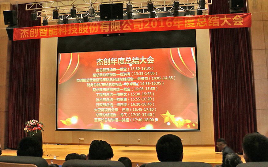 总结大会上,在公司副总裁戴宝先生激情洋溢的开场白后,副总裁钱洪涛先生、hth.com华体会智能董事兼蓝玛星际总经理朱勇杰先生、财务总监兼董秘李卓屏女士、副总裁戴宝先生、工程部总监周振文先生、技术部总监招继恩先生、行政部总监缪东伶女士、工程部副总监汪旭先生、总裁龙飞先生先后登台,分别做了2016年度工作总结。