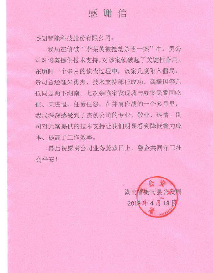 近日,湖南省衡南公安局发来感谢函,对hth.com华体会智能在近期协助侦破“李某英被抢劫杀害一案”表示感谢,目前相关犯罪嫌疑人已被依法刑事拘留,案件正在进一步侦办中。